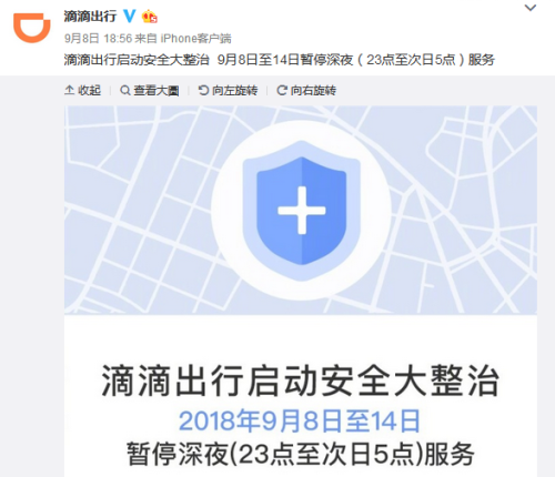 在接连出现恶性杀人事件后,滴滴痛定思痛推出整改措施,这点值得肯定。但整改中的另外一项措施却有些出乎大家的意料。滴滴宣布9月8日23点至9月15日凌晨5点期间,在中国大陆地区暂停提供深夜23:00-5:00时间段的出租车、快车、优步、优享、拼车、专车、豪华车服务。