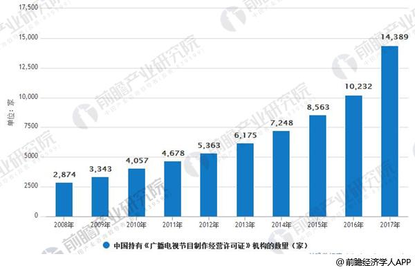 近年来,随着电视剧行业的相关政策放宽以及各种扶持政策的出台,我国电视剧市场在20 世纪90年代尝试制播分离后,开始向民间资本开放,电视剧制作机构数量逐年稳步增长。据前瞻产业研究院发布的《电视剧行业发展前景与投资机会分析报告》数据显示,2008-2017 年期间,我国持有《广播电视节目制作经营许可证》的机构从2,874 家增长至14,389 家,年均复合增长率达19.60%,呈现快速增长态势。