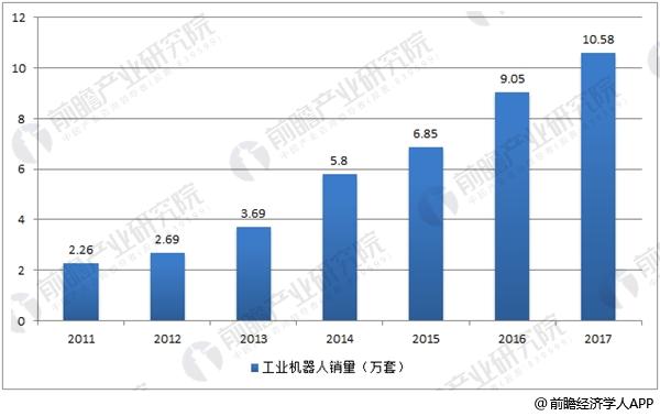 前瞻产业研究院报告数据显示,2013年,中国工业机器人购买量已超过3万台,位居全球首位。2016年中国工业机器人销量9万台,同比增长31%,远高于14%的世界平均增速。2011年-2016年中国工业机器人销量年均复合增长率为32.1%,2017年中国工业机器人销量约10.58台,同比增长16.9%。