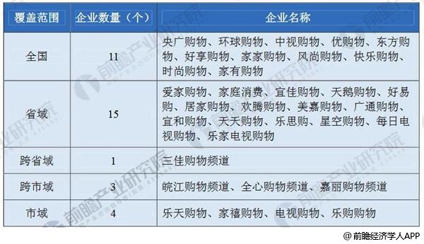 我国电视购物实行准入制度。目前,全国经国家新闻出版广电总局颁发运营牌照的电视购物企业共有34家。其中,信号覆盖全国的电视购物企业有11家,覆盖省域的有15家,覆盖跨省域的有1家,覆盖跨市域的有3家,覆盖市域的有4家。