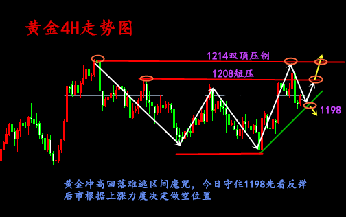 昨日黄金日间小幅回落之后企稳1203一线,美盘起始阶段走出了破高的走势,美盘延续上行,再次出现近期新高1212.5,后面的一波回撤没有布局,很多人会觉得很可惜,在我看来并不是这样,虽然历史行情表明金价有回撤的空间,渗金熊也一直在强调1212的阻力,那么在一个临近凌晨的时间点,去博一个高风险的单子,就算最后是赚了钱,那么内心的那份不安依然会停留,那么在经历了昨日的跌宕起伏,黄金行情今日又该如何布局呢?前整体行情就形成了一个既破高点又下跌破底的局面,对于整体的上升来说无疑是整体框架的破坏,就像之前所说的经验一样,破高难下跌,破底难反弹,那么今日行情,渗金熊提醒需要关注几点: