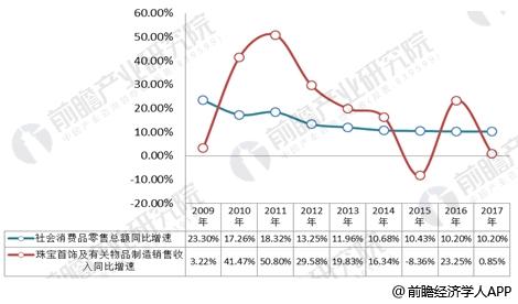 2009-2017年珠宝首饰行业增速与社会消费品零售总额走势对比走势图