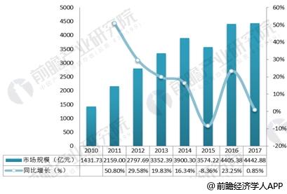 2010-2017年我国珠宝商首饰行业销售规模及增长情况