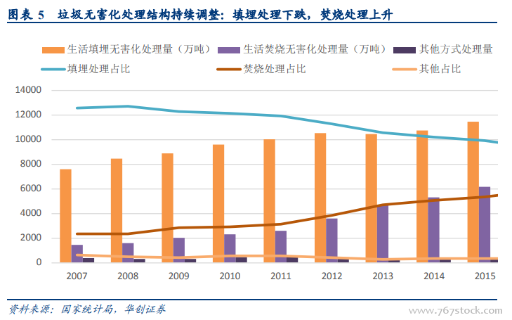 总的来说,我国填埋处理为主的垃圾处理结构将逐步向焚烧为主转变。一方面是由于当前我国各地城市土地价格普遍呈现上涨趋势,造成垃圾填埋的成本走高,另一方面在于城镇化率的推进造成城市用地紧张,基础设施用地供给整体呈现萎缩趋势,垃圾填埋场的用地受限。总之,垃圾卫生填埋的处理方式受到土地市场量价两方面的挤压,在垃圾处理市场占据的份额逐步缩小。