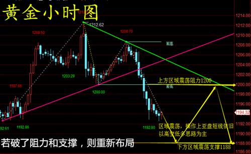 上周五暴跌之后,如若今日看延续,那么需要关注的阻力1197一线,此位置是当金价跌破1200整数关口的时候,继续反抽1197一线又继续走低,那么如果当作极弱处理,反弹一定不能超过1197凌晨高点,但如果欧盘强势破位1197,就需要当作震荡处理并重新找位置做空,那么第二个做空的位置就放在1202/1203一线