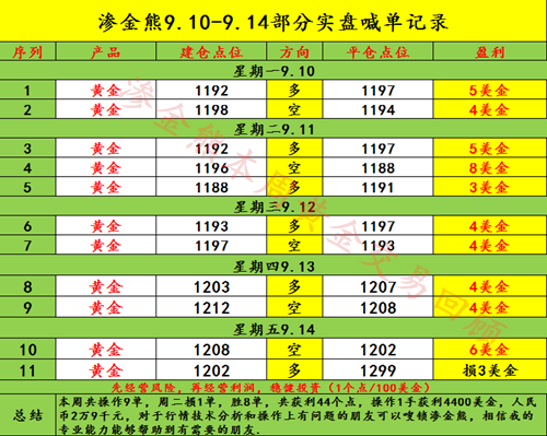 上周渗金熊老师共操作11单,胜10单,损1单,获利44个点,上文也有说到,本以为本周会大获全胜,不曾想周五却因为自己的过于自信造成损单,总的来说本周整体行情还是把握的比较到位的,这离不开我们每天提前的策略分析以及操作思路,同样离不开学员的配合,渗金熊之前也说过再好的策略你不跟随也是白搭,本周黄金用区间震荡形容再好不过,而渗金熊更是完美的把握了行情,每天稳扎稳打,获利满满,相信持续关注渗金熊的朋友,也应该小有收获,毕竟早间有朋友跟渗金熊说近期跟着我的思路操作,赚了不少,也是他进入市场以来做的最轻松的时候。