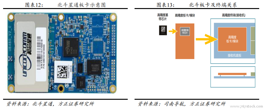 北斗板卡:技术突破降成本,“一带一路”拓空间。板卡是利用导航芯片、外围电路和嵌入式控制软件,制成带输入输出接口的板级产品,用户利用这个模块结合应用需求能够开发各种应用。北斗芯片及板卡的功能相当于电脑的 CPU 与主板,用于信号接收后的解调和解算。