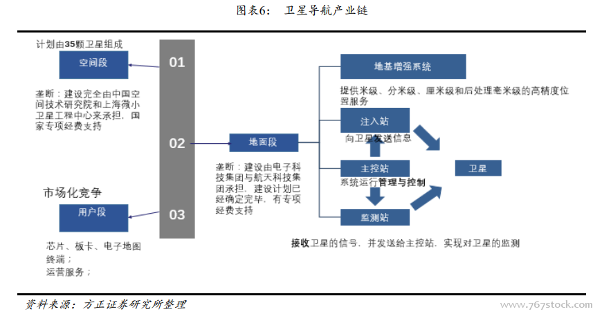 技术助推产业成熟化,铺垫千亿市场空间。北斗卫星导航产业链可分为五个关键环节:1、卫星制造;2、卫星发射;3、地面设备;4、卫星导航应用;5、下游市场。
