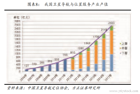 产业链中游产值最大,下游保持快速增长态势。据《2018 卫星导航与位置服务产业发展白皮书》,2017 年我国卫星导航与位置服务产业总产值达 2550 亿元,较 2016 年增长 20.4%,其中北斗贡献了超过80%。各环节均有所提升但增速不同,中游和上游受到芯片、板卡、核心器件、终端设备价格下降的影响,产值增速较去年进一步放缓,在全产业链中占比仍然呈现下降趋势。