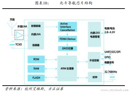 芯片:巩固北斗核心基础,北斗三 SoC 芯片自主可控。卫星导航芯片是终端接收机的核心模块,其中射频部分对微弱的模拟信号进行接收、滤波、放大、变频及放大,其性能决定了后续信号处理的效果。基带部分则实现对码信号的解算,其中相关器模块实现对码信号的“读取”。