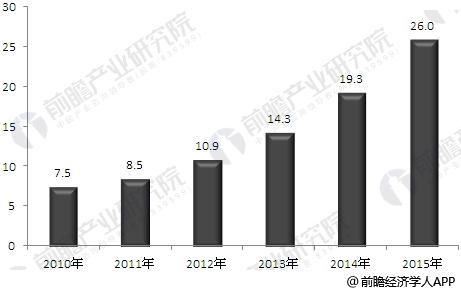 据前瞻产业研究院发布的《荧光显微镜行业市场前瞻与投资规划分析报告》测算,2010年我国荧光显微镜行业市场规模为7.5亿元,到2015年增长至26亿元,年均复合增长率达到了28.23%。可见,随着国家对仪表仪器产业发展的重视,以及我国在荧光显微镜上技术的提升、品牌的逐渐建立,荧光显微镜行业市场规模不断壮大。