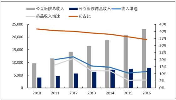 公立医院总收入、药品收入(亿元)及药占比变化情况