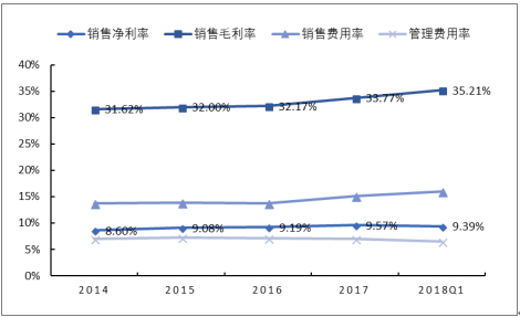 2017年和2018年1-3月,医药行业整体表现好于2016年和2017年同期水平。整体医药行业在消费升级、创新政策、医保招标、控费、两票制的执行等多种因素影响下,全部子行业均表现出收入和销售费用大幅上升,并致使毛利率上升、净利率相对稳定的情况。