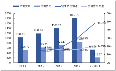 在医药行业迎来变革,毛利率提升的过程中,销售费用亦大幅提高。2017年和2018年Q1,268家样本公司合计销售费用达到1807.76亿元和533.96亿元,同比增长29.75%和48.42%,销售费用率分别上升到15.06%和16.01%。同期的管理费用保持了低于收入增速的增长,2017年和2018年Q1,268家样本公司合计管理费用分别840.79亿元和215.37亿元,同比增长15.94%和21.01%,管理费用率分别上升到7.00%和6.46%,均低于2016年同期水平。