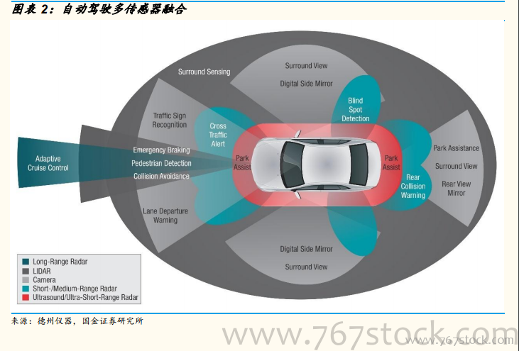 摄像头:自动驾驶的眼睛识别标识、物体,但无法点阵建模、远距测距。摄像头技术最为成熟,车载应用起步最早,在 ADAS 阶段作为绝对主流的视觉传感器,根据功能不同需要 4 个到 8 个摄像头,应用在车道监测、盲点监测、障碍物监测、交通标志识别、行人识别、疲劳驾驶监测、倒车影像、360 全景影像等等。