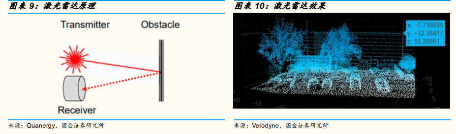 将是自动驾驶传感器的核心部分。首先,激光雷达提供生成环境的 3D 点云图像提供一系列的(x,y,z)坐标,与已有的高精度地图上的坐标进行对比,就可以很精确地做出车辆定位。同时在感知功能上,激光雷达点云图像比摄像头少了一步处理步骤(数字化),即摄像头图片需要进行数字化处理后才能由计算机进行判断物体类型等工作,而激光雷达生成的点云(实际是 TOF 数据)只需简单运算就可得到坐标数据,方便进一步的判断。
