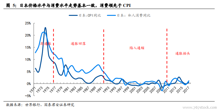 消费增速与价格走势基本一致,消费领先于 CPI。1970 年代消费开始高速增长,随后 CPI 走高,1960-1977 年日本经历高通胀,平均 CPI 高达10.76%;经济换挡期消费增速回落,价格水平也开始回落;而在失去的20 年里,消费增长几乎停滞,日本陷入通缩,平均 CPI 为负;2010 年后消费开始回暖,CPI 也有爬升的迹象。因此纵观日本经济史,消费增速与价格水平的走势基本保持一致,但一般 CPI 的变化会滞后于消费。