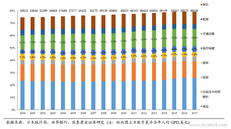 日本人均 GDP 结构变化,服装支出占比下降,交通运输与医疗保健支出占比提升。近 20 年间,日本人均 GDP 在 32000-49000 美元之间徘徊,居民的支出结构也相对稳定,其中食品、住宿及水电等、家居、教育、娱乐支出占比分别在中枢 23.7%、13.7%、3.5%、 4.1%、10.2%附近窄幅震荡;服装类支出占比从 2000 年 5.1%下降至 2017 年的 3.8%;而医疗保健和交通运输支出占比则分别从 2000 年的 3.6%和 11.5%上升至2017 年的 4.5%和 14.0%。