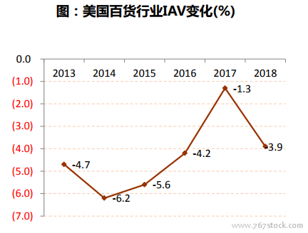 百货行业对美国GDP的贡献率,即行业增加值(IAV),自2012年起持续下降。2018年,在美国经济强劲复苏的背景下,百货行业IAV降幅达-3.9%,对整体经济的贡献持续下降,标志着美国百货行业进入了行业生命周期的衰退期。