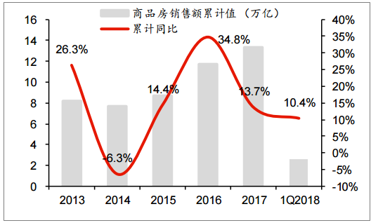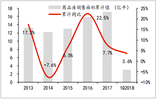 据前瞻产业研究院发布的《房地产行业市场需求预测与投资战略规划分析报告》数据显示,2017年及2018年一季度商品房销售保持增长势头,但增幅有所放缓。2017年全年商品房销售面积16.94亿平方米,同比增长7.7%,低于2016年22.5%的增幅水平;2018年一季度销售面积3.01亿平方米,同比增长3.6%,也低于2017年一季度19.5%的水平。销售金额方面,2017年全年及2018年一季度分别实现13.37万亿元和2.56万亿元,分别同比增长13.7%和10.4%,均低于上年同比增幅水平。