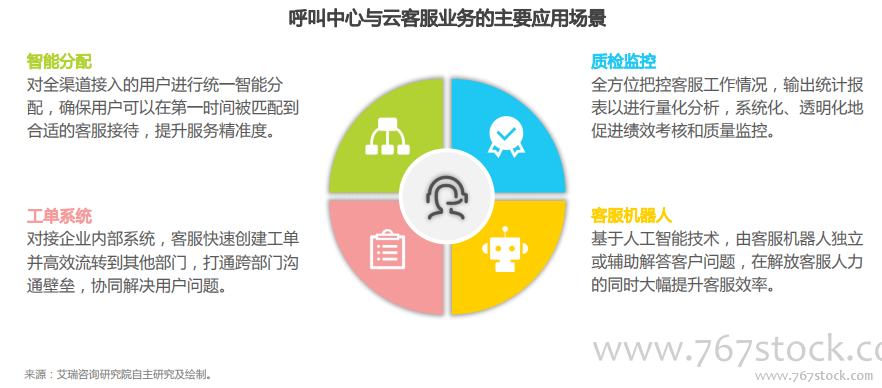 呼叫中心与云客服用于企业与用户间的双向联络。呼叫中心和云客服可以以SaaS或PaaS服务的模式提供给企业客户,用来满足企业售前售后和用户间双向联络的需求。云呼叫中心支持分布式地理条件,具备低成本和灵活性等诸多优势,已经成为众多企业客户搭建呼叫中心系统的最佳选择。云客服的出现是以电话为主的联络方式向多样化渠道延伸的结果。典型的云客服产品不仅能够整合APP、微信、微博、网页、邮件等各类型渠道,并且可以通过工单系统与企业内部各部门对接,高效协同解决用户的问题。利用人工智能技术,新兴的客服机器人可在金融、电商、教育等特定场景中预判和解答用户问题,可以辅助甚至部分替代人工客服的工作。