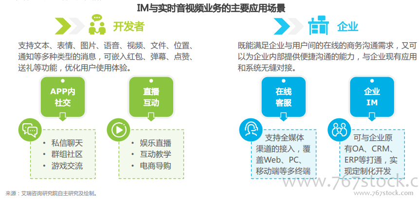 IM与实时音视频满足企业的互联网云通讯需求。进入互联网时代尤其是移动互联网时代,以IM和实时音视频为代表的互联网云通讯在一定程度上替代了传统的短信和语音。同样作为通讯服务中的基础能力,互联网云通讯常被以API/SDK的方式提供给开发者和企业客户。他们可以轻松地将IM和实时音视频的能力嵌入到自有的网站、APP产品,或者与企业内部的各种业务系统实现无缝对接。对于开发者而言,他们的应用通常是直接面向C端用户的具有强社交和互动属性的产品,运用互联网云通讯能够帮助他们有效的提升用户体验,增加用户的活跃度和粘性。