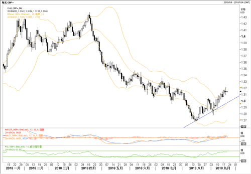 昨天英镑/美元横盘震荡。据英国泰晤士报称,英国首相据悉将拒绝欧盟首席脱欧谈判官巴尼耶对爱尔兰脱欧协议的提议,原因是北爱尔兰边境方案触犯了英国的"红线",不允许分离北爱尔兰与英国关税分离。消息传出令市场增添对脱欧谈判的担忧。除了脱欧方面,英国也公布一系列经济数据,8月CPI月率录得0.7%,预期0.5%,与前值持平。CPI年率录得2.7%,创下六个月来新高,利好英镑。技术面上,日线图RSI走高,MACD红色动能柱扩张,上涨趋势基本确立。操作上以多头为主,目标1.33。