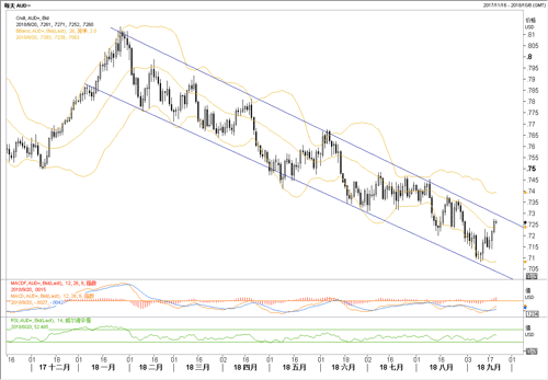 因基础金属价格上涨,以及中国方面的一些利好消息传出,澳元近期得到一定的提振,自0.7085展开近200点的反弹。市场预期澳洲联储在未来一段时间都会按兵不动。技术上看,目前澳元/美元交投于0.7260附近,为下行通道的61.8%回撤位,暂时看构成有力支撑,但长远看,仍在自0.8136以来的下跌通道中,除非汇价能突破0.7380才打破通道。操作上建议短线观望,中长线介入澳元空单,目标0.71。