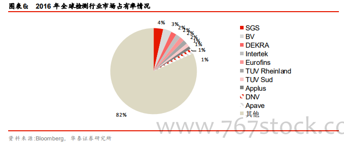 并购活跃,每年 150-200 起。彭博提供的数据显示,2016 年全球检测行业前十名市占率合计 18%,市占率最高 SGS 只有 3.6%。根据 Catalyst Corporate Finance 的报告,在2010-2015 年间,Eurofins,Applus,Intertek, BV, SGS 等 12 家公司共完成超过 350 起并购。据该机构估计,全行业每年 150-200 起并购,约 80%的收购对象为营收小于一千万欧元的小公司。