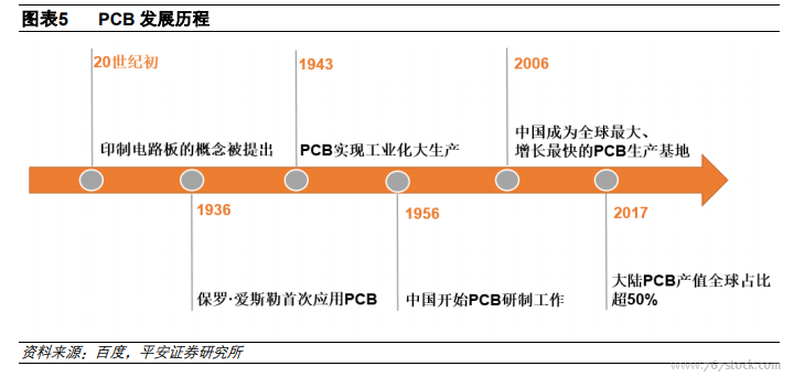 大陆转移积极承接全球产能,成发展主力。印制电路板的概念从 20 世纪初被科学家提出。1936 年,保罗·爱斯勒(Paul Eisler)首先在收音机装置中采用印制电路板。1943 年,美国人将此项技术用于军用收音机,PCB 得以实现工业化大生产。1956 年,中国开始 PCB 研制工作。1978-1998 年,由于引进了国外的先进设备和技术,中国 PCB 产业得到快速发展,从 2006 年开始,中国超过日本成为全球最大、增长最快的 PCB 生产基地。目前,产业向中国大陆转移趋势已定,2017 年大陆 PCB 产值全球占比超 50%,大陆已经成为推动全球 PCB 行业发展的主要动力。