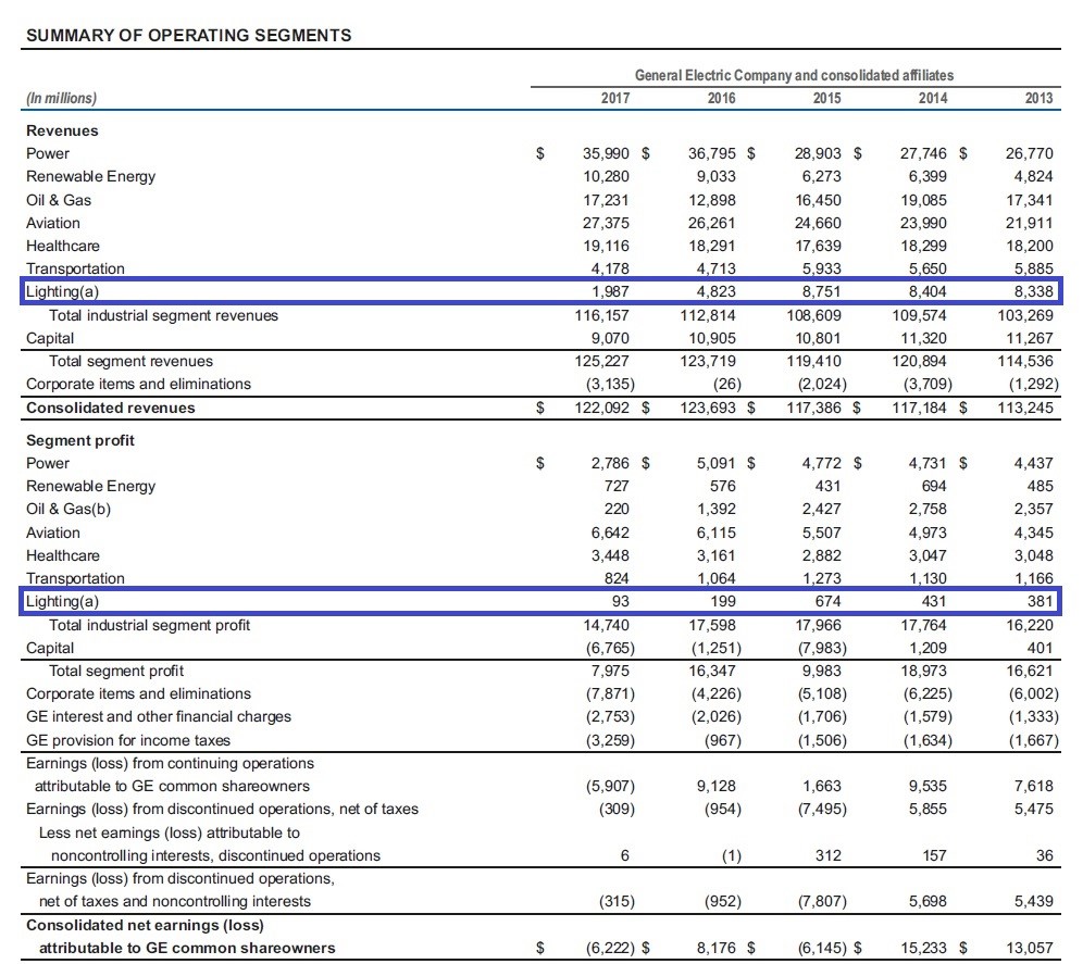 而就GE年報中過去幾年的各領域的營收與獲利數字來看,更不難理解為什麼GE想要退出一般照明市場。2013年至2017年GE的獲利率分別為4.6%、5.1%、7.3%、4.1%、4.7%,而年報中其他事業的獲利率則都有10%至20%的水準,照明無疑是GE最不賺錢的事業。