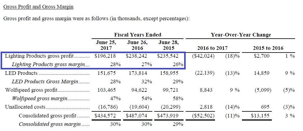 相較之下,Cree的照明產品包含了LED照明系統與燈泡,並且維持獲利表現。然而,若從其毛利率表現來看,2015年至2017年Cree照明產品的毛利率多維持在26-28%,2017年的毛利率卻已出現較2016年下滑18%的狀況。