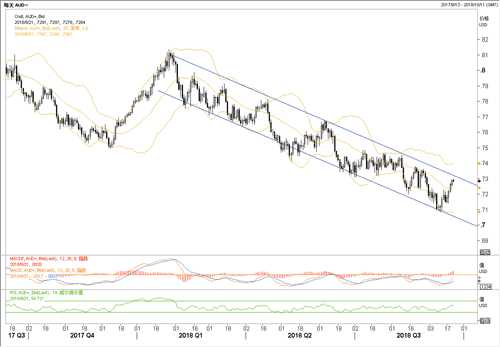 昨日澳元微涨,在全球股指普涨的大环境下,澳元近期一改颓势,表现出乎意料地好。鉴于澳洲央行一直暗示对澳元的贬值偏乐观,利率政策预期维稳的料澳元涨势难以延续。技术上看,目前澳元/美元有回撤风险,下跌通道完好,除非汇价能突破0.7380才打破通道。操作上建议短线观望,中长线介入澳元空单,目标0.71。