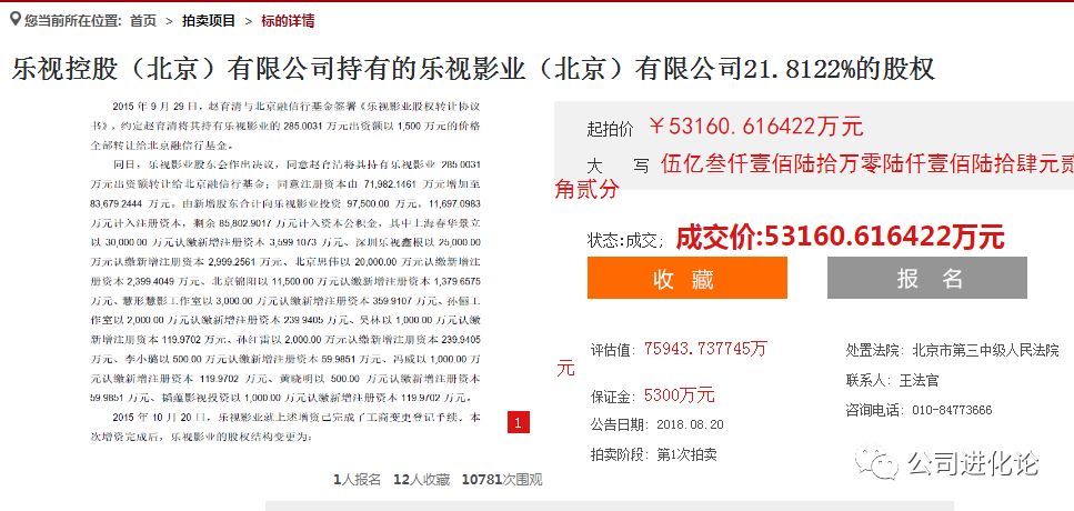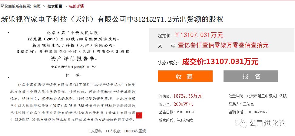 8月20日,人民法院诉讼资产网发布了乐视三个产业股权的拍卖公告,被拍卖的股权有:新乐视智家电子科技(天津)有限公司中31245271.2元出资额的股权、乐视控股(北京)有限公司持有的某公司26183537元出资额的股权、乐视控股(北京)有限公司持有的乐视影业(北京)有限公司21.8122%的股权,它们对应的起拍价分别为13107.031万元、10983.693万元、53160.616422万元;对应的评估值分别为18724.33万元、15690.99万元、75943.737745万元。