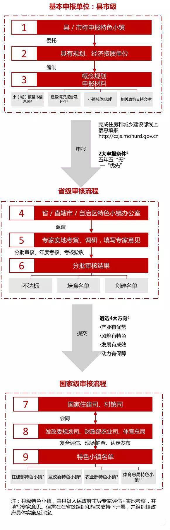 2017年12月4日,国家发展改革委、 国土资源部、环境保护部、住房城乡建设部四部委联合发文,就特色小镇申报、审批做出最新指示。对已公布的两批403个全国特色小城镇、96个全国运动休闲特色小镇等,开展定期测评和优胜劣汰。第三批特色小镇申报在即,下面用一张图为大家简单明朗的介绍一下特色小镇的申报流程。