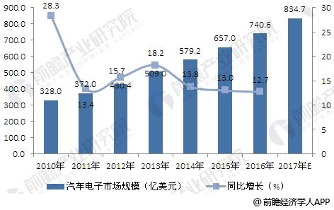 随着汽车销量增长,以及汽车电子占汽车总成本比重的增加这两种趋势的叠加,汽车电子市场规模持续增长。据前瞻产业研究院发布的《汽车电子行业市场前瞻与投资战略规划分析报告》数据显示,2016年,我国汽车电子行业市场规模约740.6亿美元,同比增长12.7%;据此增速测算,2017年,我国汽车电子行业市场规模约834.7亿美元。