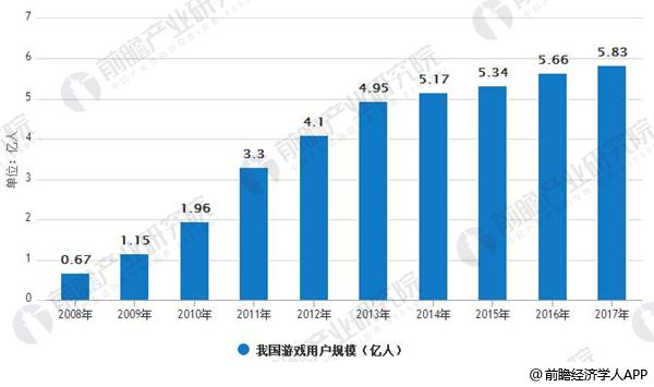 近年来,随着互联网、移动互联网技术的兴起和快速发展,互联网基础设施越来越完善,互联网用户规模迅速增长。据前瞻产业研究院发布的《网络游戏行业商业模式创新与投资机会分析报告》数据显示,受益于整个互联网产业的爆炸式增长,我国网络游戏产业呈现出飞速发展的态势,网络游戏整体用户规模持续扩大,2008 年我国游戏用户规模为0.67 亿人,到了2017 年我国游戏用户规模增长至5.83 亿人,复合增长率达 27.17%。