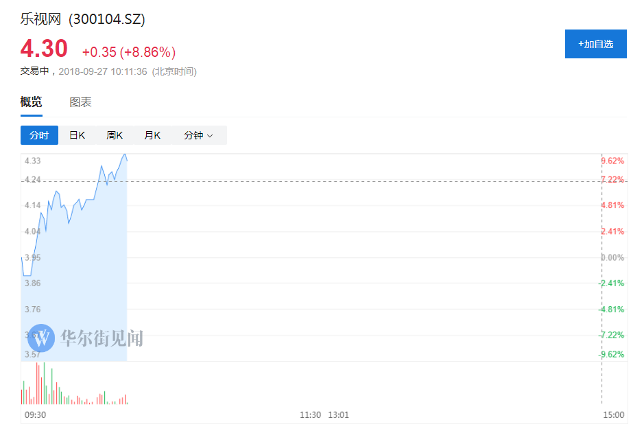 乐视网今日(9月27日)开盘后股价涨近9%,报4.3元,市值逾170亿元。