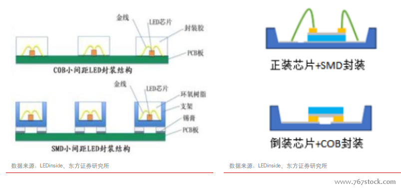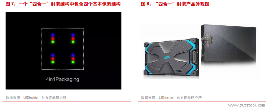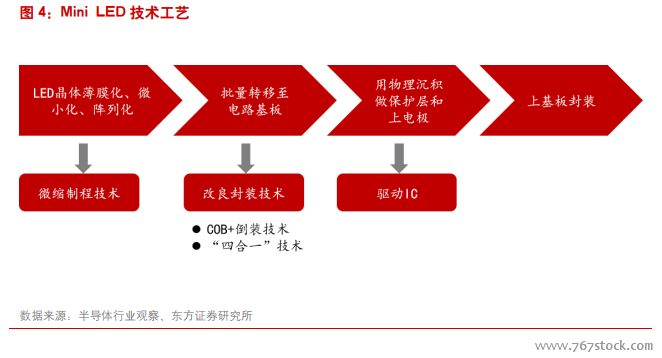 生产技术已获突破。Mini LED 的生产过程首先需要将 LED 通过微缩制程技术进行薄膜化、微小化、阵列化,使其尺寸仅为几十微米左右,再将 Mini LED 采用 COB 或者“四合一”技术批量转移到硬性、软性的透明或不透明基板上,再利用物理沉积制程完成保护层与上电极,最后进行上基板的封装,完成结构简单的 Mini LED 显示。