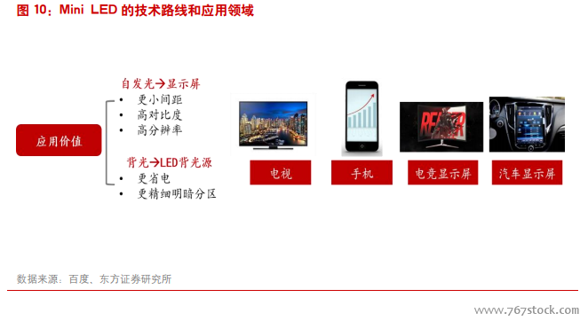 Mini LED 背光和显示屏花开并蒂。目前 Mini LED 的主要应用场景是液晶背光源和显示屏,适合手机、电视、车用面板及电竞笔记本型计算机等产品的应用。后续,随着技术的成熟和产能的释放,Mini LED 显示屏应用将带来广阔的市场空间。