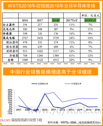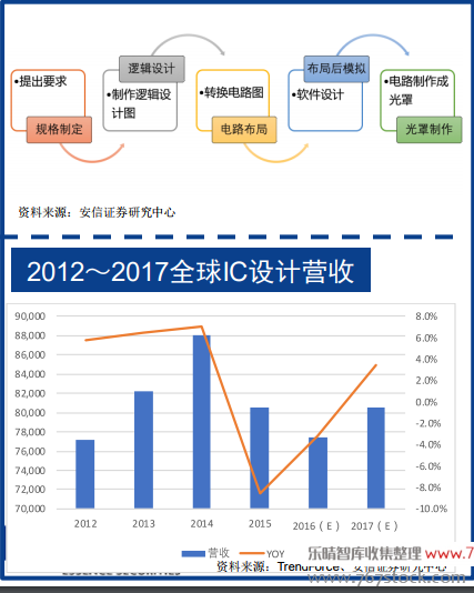 国内IC设计在全球市场立足。根据市场调研机构IC Insights统计,2017年芯片设计公司占全球集成电路总销售额的27%,与2007年的18%相比,同比增长9%。IC设计市场份额:大陆地区在2010年占据5%的市场份额,在2017年达11%。 下图显示的是,在2017年,已经有10家公司进入前50大IC设计公司榜单,在2009年名单中只有一家大陆公司。