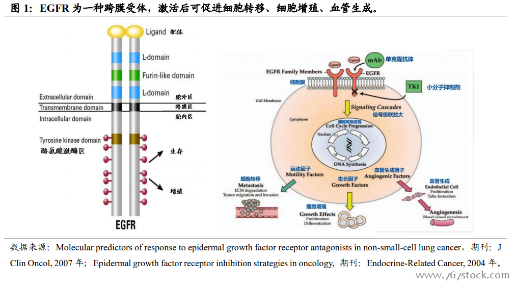 肿瘤靶向药物主要分类—酪氨酸激酶仍占主流、多靶点百家争鸣。受体酪氨酸氨激酶(Receptor tyrosine kinase, RTKS)最大的一类酶联受体,目前已发现有 50 多种不同的 RTKs 家族成员,其中主要包括成纤维细胞因子受体 (Fibroblast Growth Factor Receptor,FGFR)、表皮生长因子受体(Epidermal Growth Factor Receptor,EGFR)、血小板衍生生长因子受体(Platelet-derived Growth Factor Receptor,PDGFR)、血管内皮生长因子受体(Vascular Endothelial Growth Factor Receptor,VEGFR)和肝细胞生长因子受体(Hepatocyte Growth Factor Receptor,HGFR)等。除此外还有其他通路靶点治疗药物,本文中我们将以靶点作用位点和机理相结合的方式介绍一下肿瘤靶向药物研发的热门靶点和未来趋势。