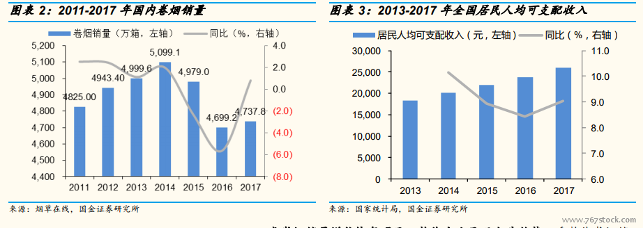 创新型香烟销量高速增长。近年国家持续推进卷烟产品结构调整,创新型香烟近年增长迅速。2017 年,创新型香烟对卷烟整体销量增量的贡献率达到 362.8%。其中细支烟销量达到 238.5 万箱,同比增长 73.0%,市场份额增加至 5.03%。除此之外,爆珠烟实现了卷烟爆珠的自主设计、自主生产和自主研发,销量也呈爆发式增长,2017 年达到 34.9 万箱,同比增长429%。短支烟同样发展迅猛,2017 年销量达到 25.0 万箱,同比增长162.3%。相比于传统粗支烟销量的负增长,未来以细支烟为代表的创新产品将是推动国内卷烟销量提升的关键。