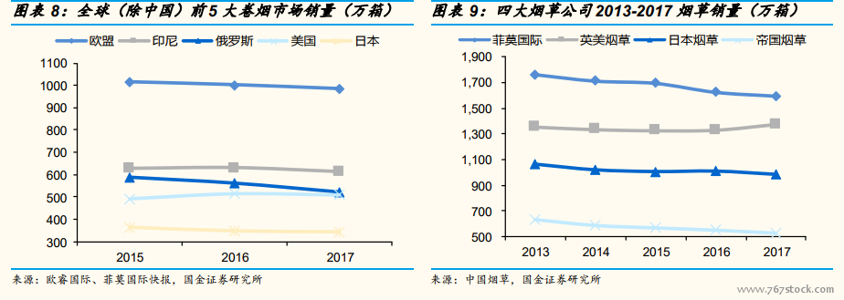 国外烟草市场萎缩大势已成。近 5 年,卷烟仍然是传统烟草制品的主要品类,占据全球烟草市场 90%左右的市场份额。但受到各国日益收紧的控烟政策影响,其销量不断下降。2017 年,全球(除中国)卷烟总销量约6200 万箱,同比下降约 2%,预计未来 5 年仍以 1%-2%的速度逐年递减。从全球(除中国)前 5 大卷烟市场:欧盟、俄罗斯、印尼、美国和日本2015 年以来的卷烟销量来看,也总体呈现出逐年下降的趋势。另一方面,世界四大烟草公司:菲莫国际、英美烟草、日本烟草、帝国烟草中除英美烟草外,2017 年的销量同比均有 3%左右的下降。根据 EuromonitorInternational 的预测,到 2021 年全球卷烟市场规模将减少 77 亿美元,国外烟草市场整体规模逐渐萎缩的大趋势已经形成。