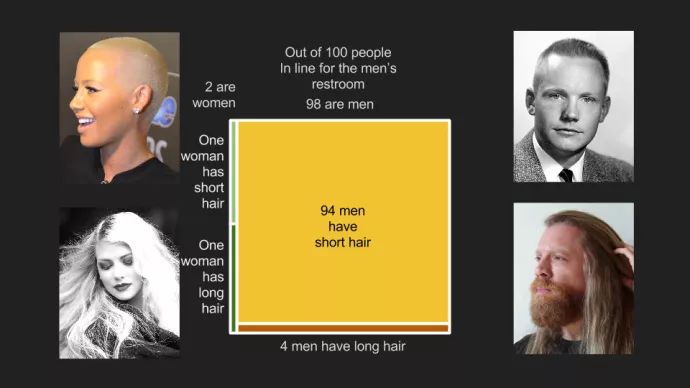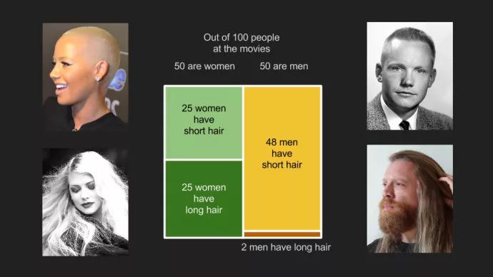 3、长方形的高度,是指“可能世界”的可能构成。例如上图,绿色长方形指女性的可能世界,进而该可能世界,是由“一半长发+一半短发”的假设比例构成。