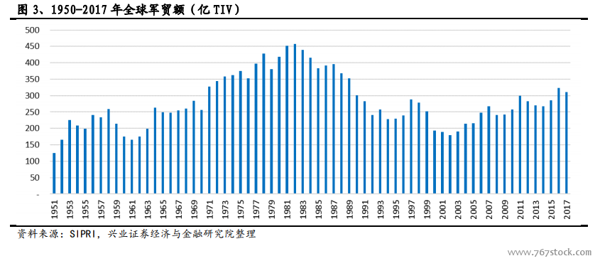 进入 21 世纪以来,全球军贸额呈现持续向上增长的趋势。根据斯德哥尔摩国际和平研究所(SIPRI)的统计数据,1950-2017 年,全球军贸额整体呈现明显的周期性波动特征。