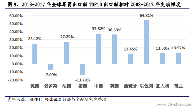 军贸出口格局稳定,行业集中度高。根据 SIPRI 的统计,世界主要军贸出口国以欧美国家为主,排名相对稳定。以五年为周期来看,2008-2012 年,前五名依次为美国、俄罗斯、德国、法国、中国;2013-2017 年,前五名依次为美国、俄罗斯、法国、德国、中国,两个 5 年间只有法国和德国的排名发生了变化。从前十名国家占比来看,军贸市场行业集中度很高:2008-2012 年,全球军贸出口额前十国家总计占比 87.46%,其中美国和俄罗斯两国合计占比 56.02%;2013-2017 年全球军贸出口额前十国家总计占比为89.56%,其中美国和俄罗斯两国合计占比 56.16%。
