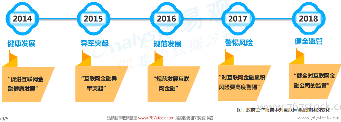 政府工作报告对互联网金融发展的要求基本奠定下年发展基调:2014年互联网金融首次出现在政府工作报告,从2014年“促进健康发展”,2015年“异军突起”,2016年“规范发展”、2017年“高度警惕风险”到2018年“强化金融监管统筹协调,健全互联网金融公司监管”,政府工作报告的要求基本上奠定了互联网金融下年的发展主题。