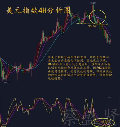 从美元指数分析图可以看出,均线系统显示美元呈空头发散向下排列,美元承压下跌,KDJ指标显示美元处于超卖区,当然这并不能说明美元指数会反弹或是反转,因为KDJ指标在使用过程中,也有失效的时候,但就在失效的时候正好说明这个趋势是强趋势,将会继续延续趋势。