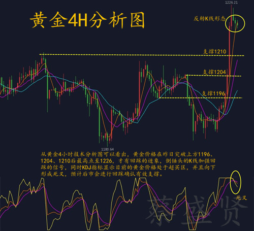 从黄金4小时技术分析图可以看出,黄金价格在昨日突破上方1196、1204、1210后最高点至1226,才有回踩的迹象,倒锤头的K线加强回踩的信号,同时KDJ指标显示目前的黄金价格处于超买区,并且向下形成死叉,预计后市会进行回踩确认有效支撑。